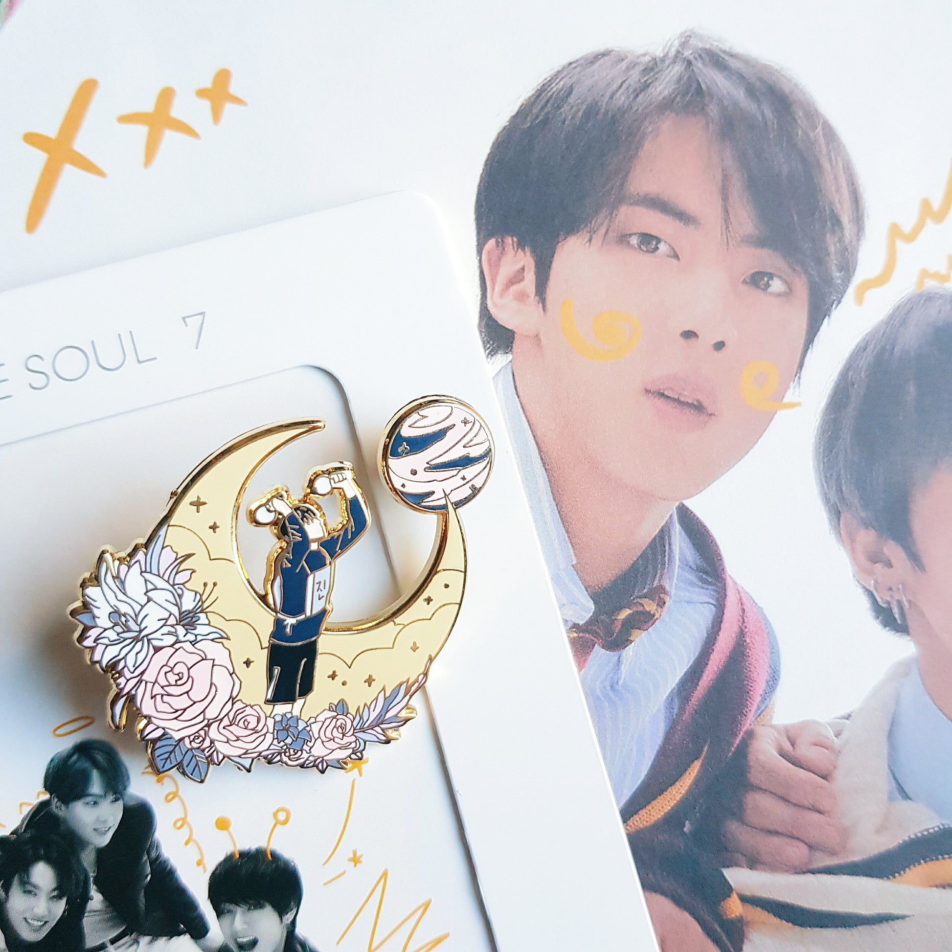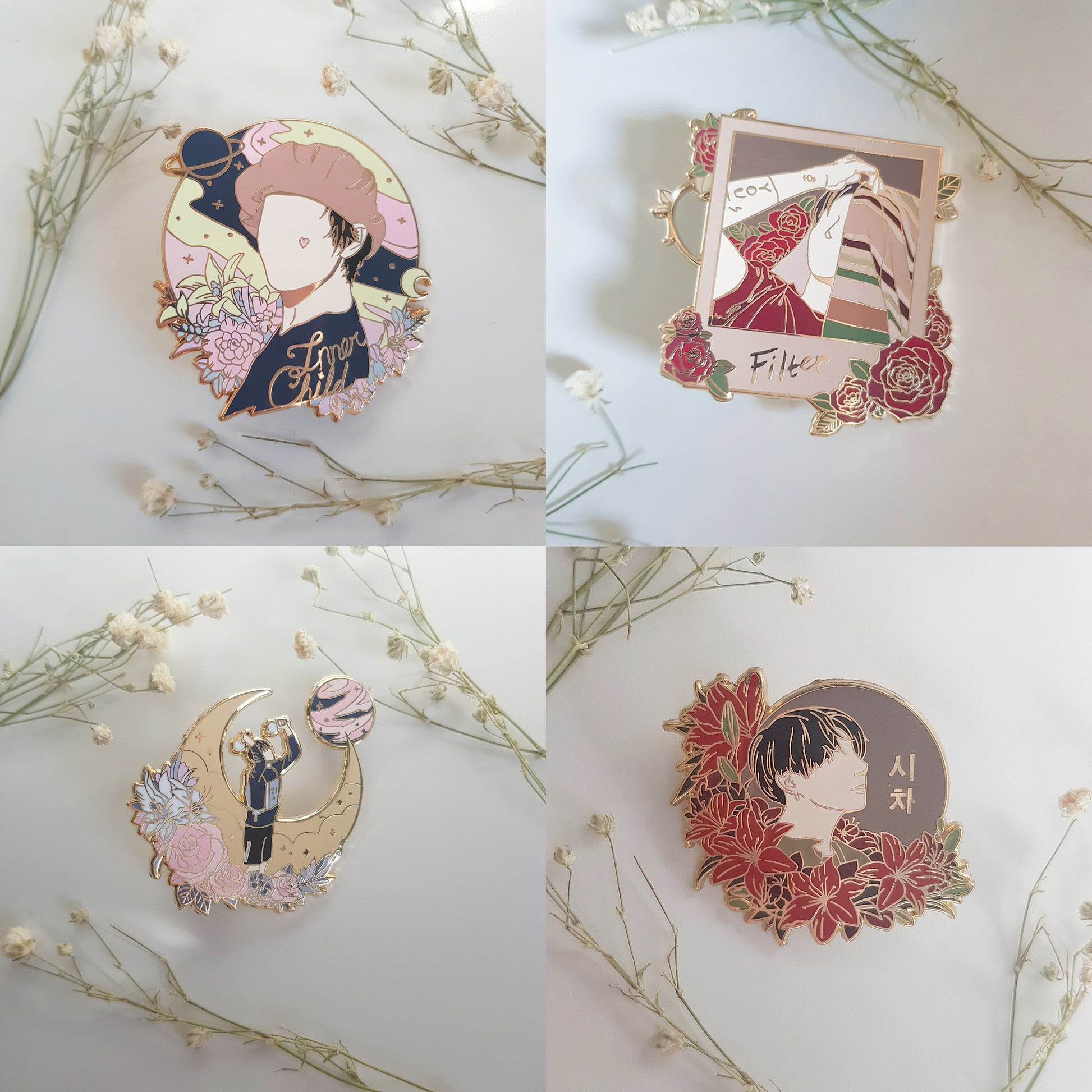 Hard enamel pin with gold finish. About 40-55 mm in height. Filter, Inner Child, Moon, and Jungkook's Tiger Lily Pin (no spin)