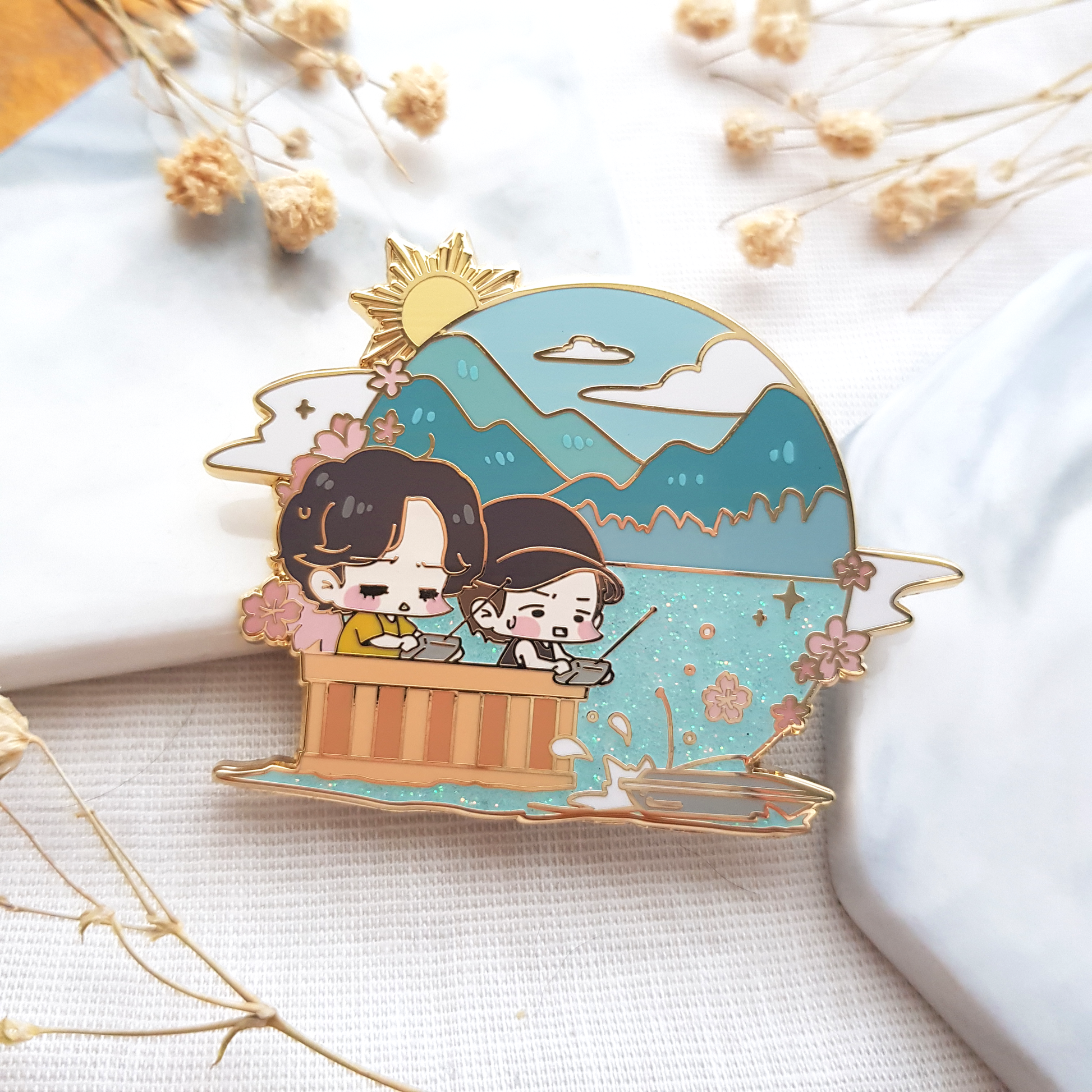Hard enamel pin with gold finish. About 47mm in height.